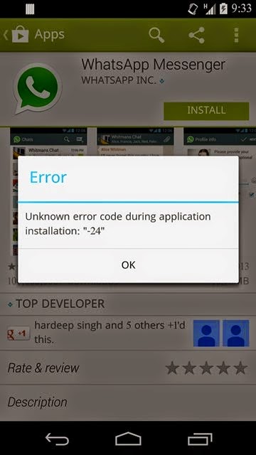 Most people are getting unknown error 24 in Google Play while installing or downloading Whatsapp, Viber, Facebook messenger, Skype etc. This problem is also common in Android that have just received a software update. The "Unknown error code during application installation: -24"